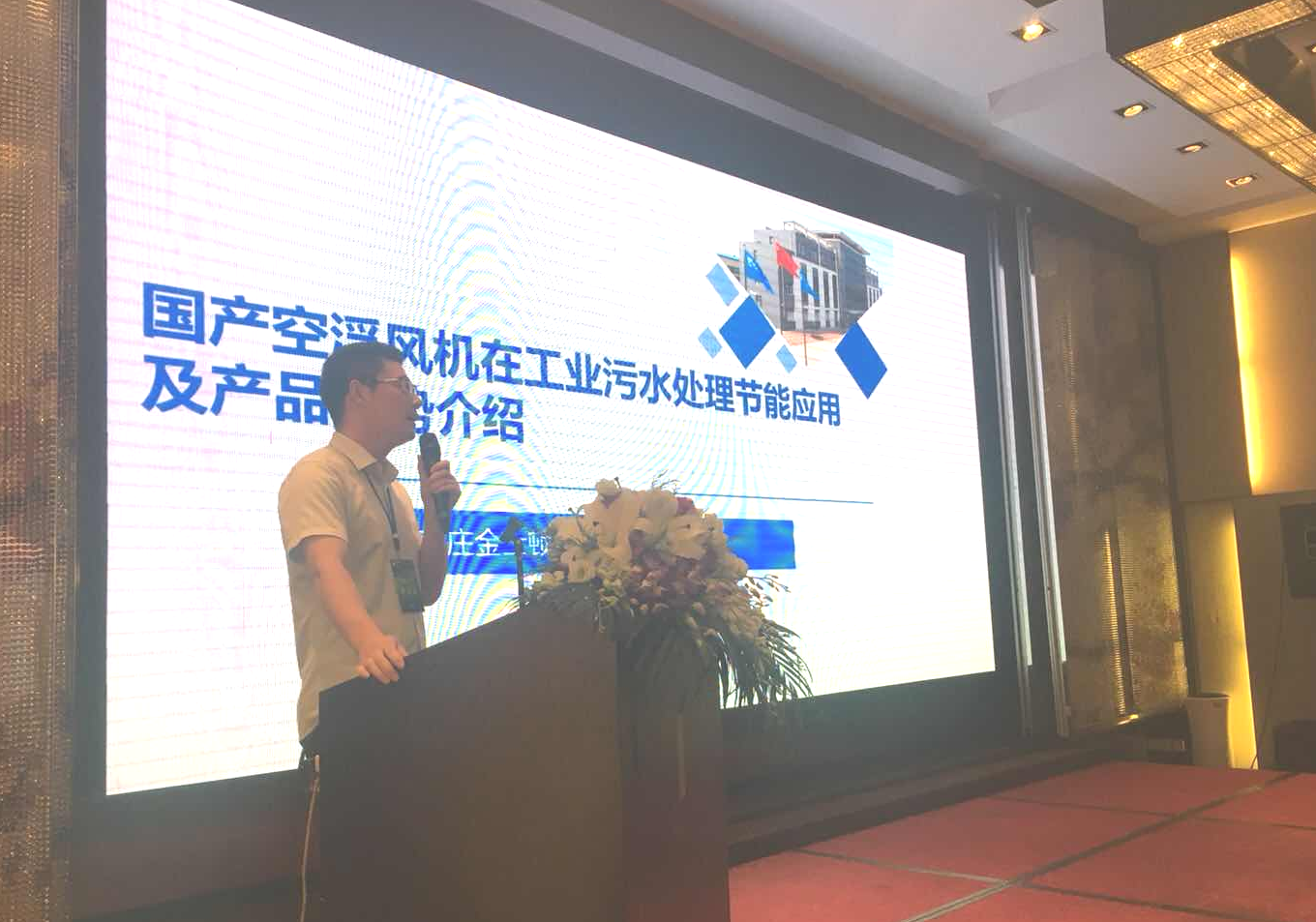 石家庄金士顿轴承科技有限公司副总经理王青峰做了“国产空浮风机在工业污水处理节能应用及产品优势”的介绍