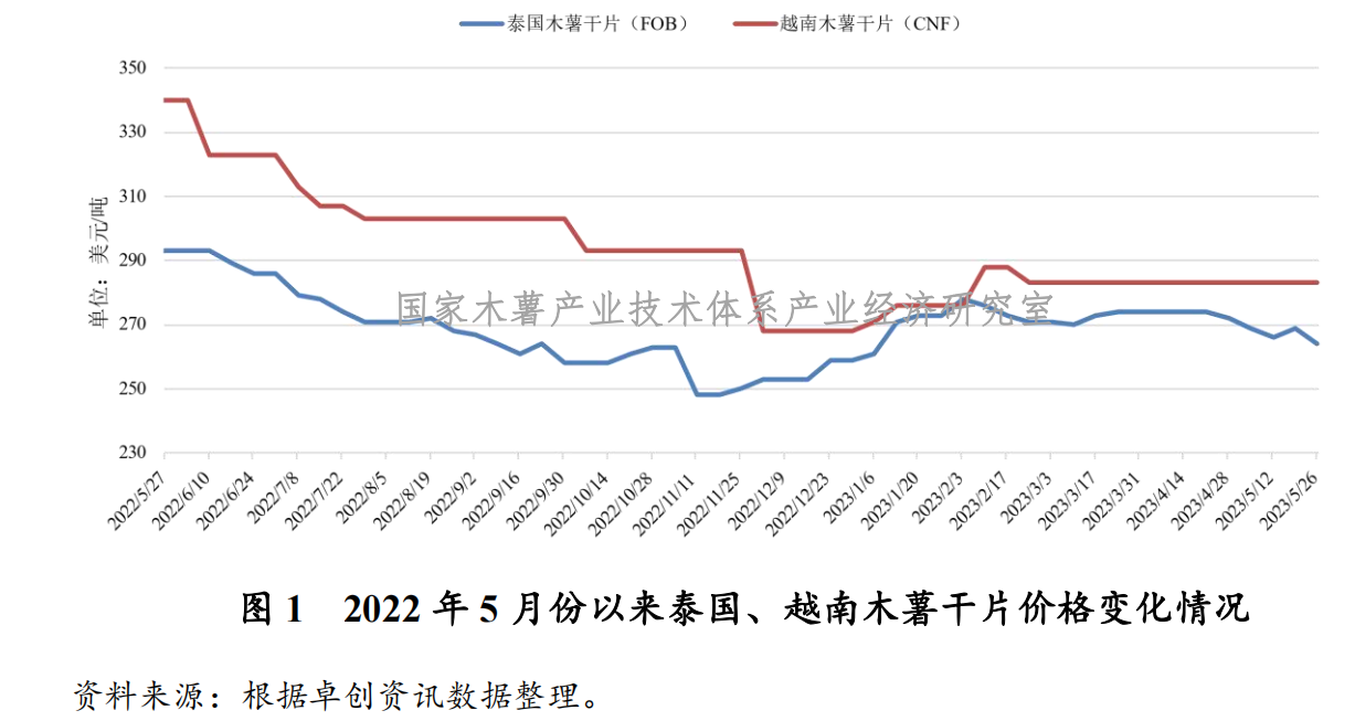 2023年1~4月,中国木薯干片进口量和进口额为307.45万吨和8.42亿美元,同比分别增长5.71%和5.66%。其中,从泰国、越南进口的木薯干片数量分别为268.30万吨和38.57万吨,分别占中国木薯干片进口总量的87.27%和12.55%。(中国海关总署,5月26日)