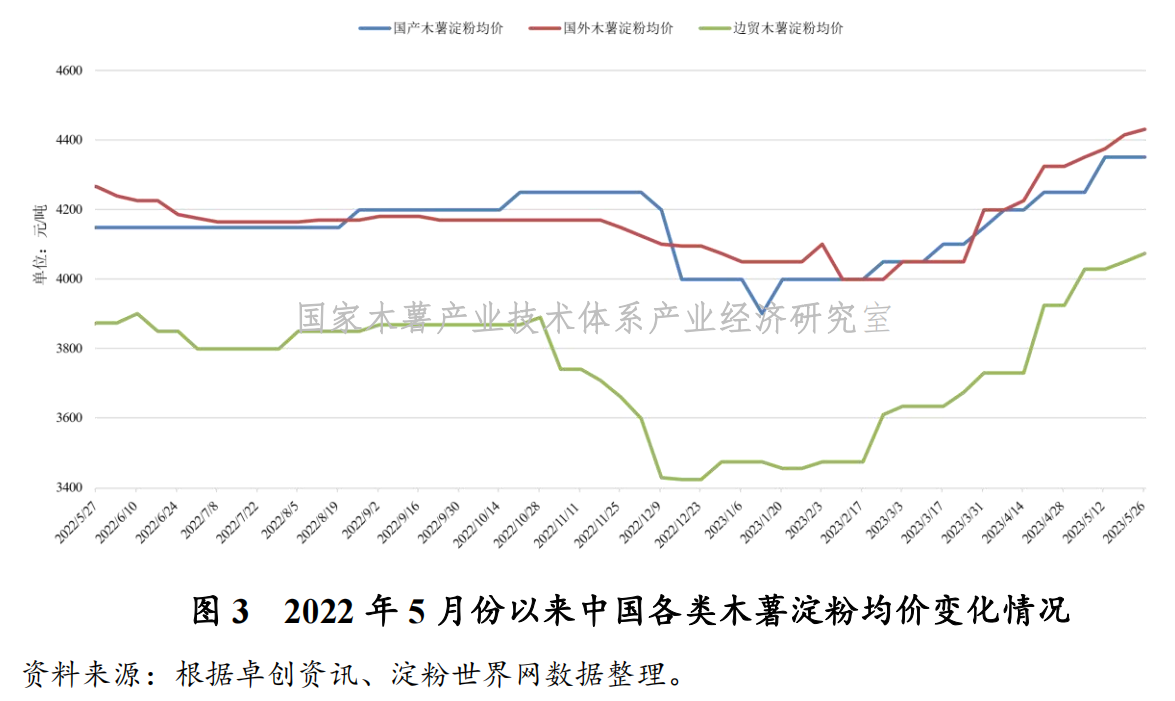 从国内木薯淀粉市场行情来看,外盘报价仍处于高位,进口成本居高不下,外加人民币持续贬值,木薯淀粉现货价格稳中上涨。近期下游市场陆续进入行业淡季,贸易商基本按需采购。本周国内木薯淀粉市场整体价格较上周略有增长,其中,泰国中高端木薯淀粉含税报价为4250~4580元/吨,较上周小幅上涨30元/吨;越南主流木薯淀粉含税报价为4180~4280元/吨,较上周小幅上涨15元/吨;边贸淀粉市场中,广西边贸市场过关淀粉维持低位,当前主流木薯淀粉报价为4000~4150元/吨,较上周小幅上涨25元/吨;国产淀粉厂家没有库存积压,主流木薯淀粉报价为4350~4450元/吨(见图3)。